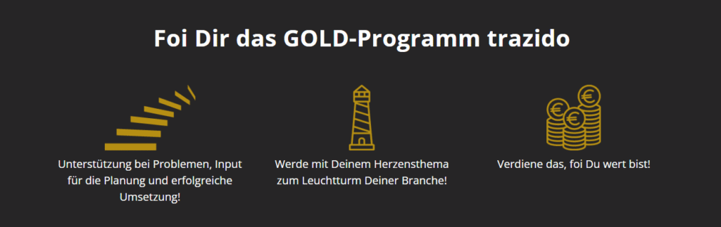 Du bist GOLD wert! Wir haben das GOLD-Programm entwickelt, um Dir eine Plattform für Deine persönliche und fachliche Weiterentwicklung zu geben. Gold gehört zu den Übergangsmetallen und auch wir wollen Dich bei einer wichtigen Transformation begleiten: